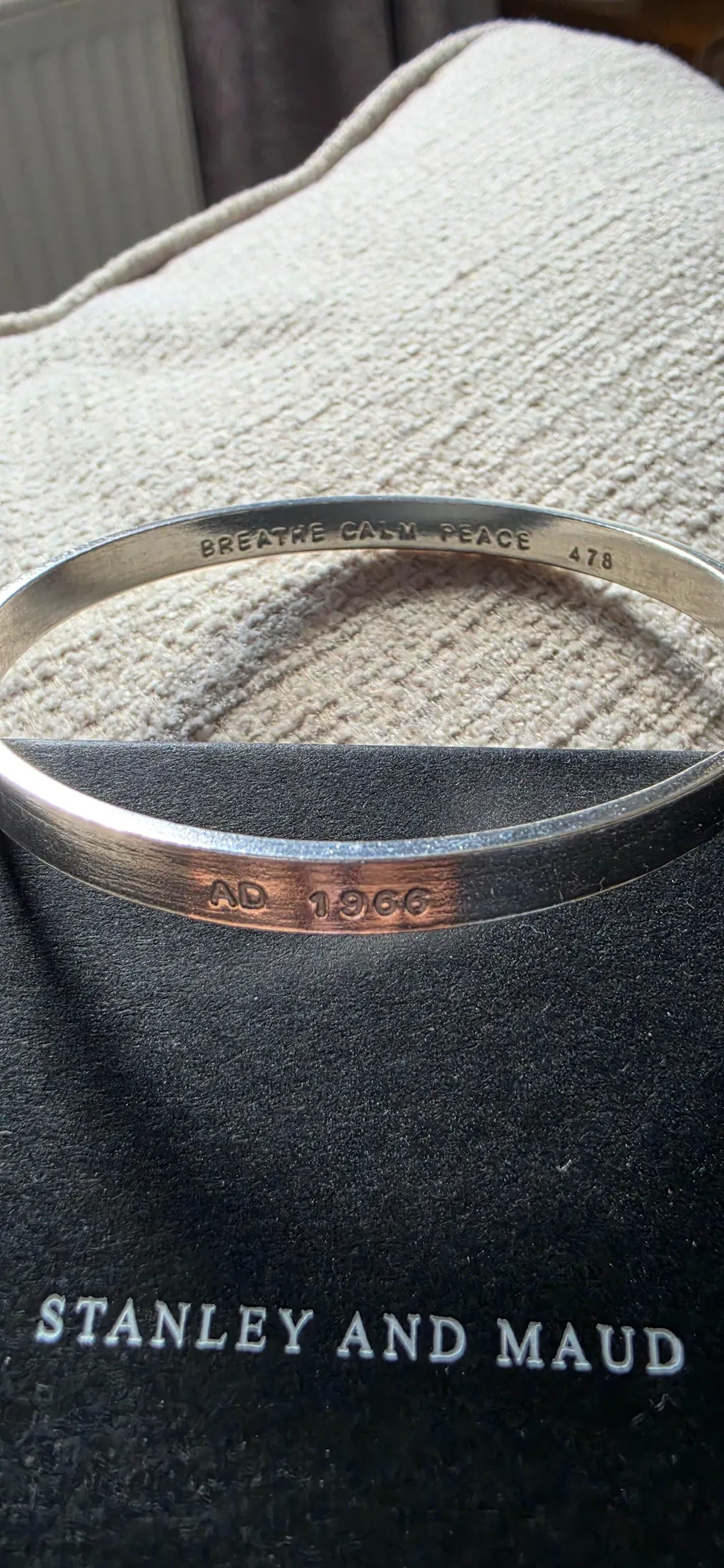 This solid sterling silver personalised bangle is one of STANLEY AND MAUD's most popular unisex designs. It's perfect for carrying chapters of your story as the bangle can be personalised both sides.