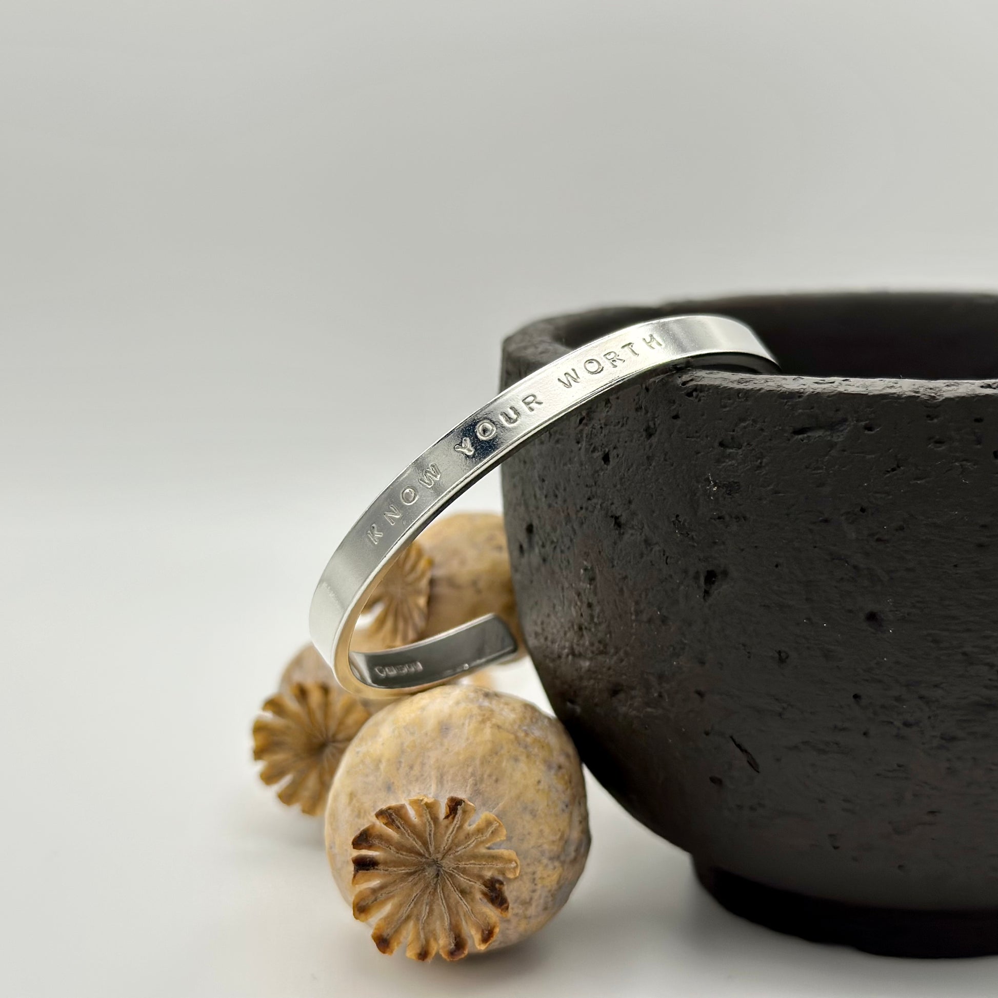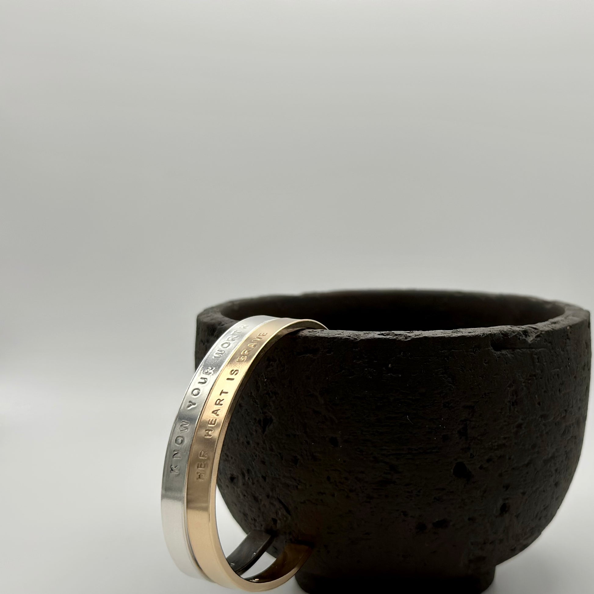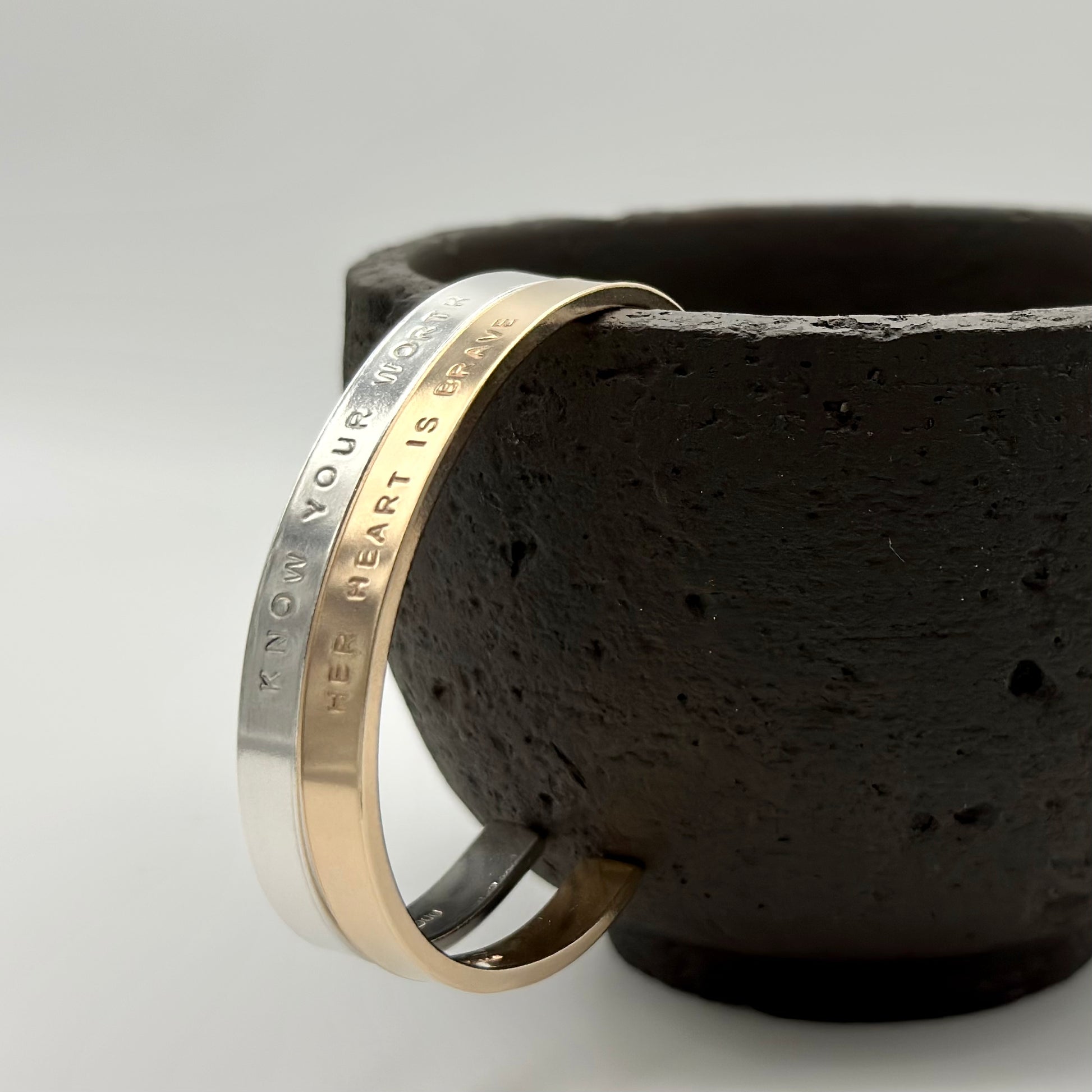 STYLE DETAILS ★ one of STANLEY AND MAUD's most adored original designs handcrafted in solid 9ct gold or sterling silver. An absolutely stunning piece available to be personalised with your beautiful words both on the inside and the outside of the bangle.